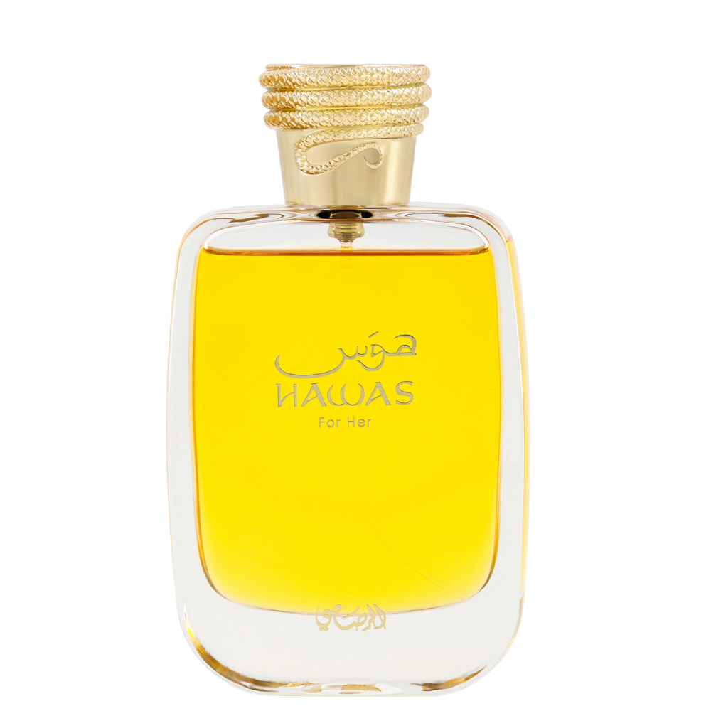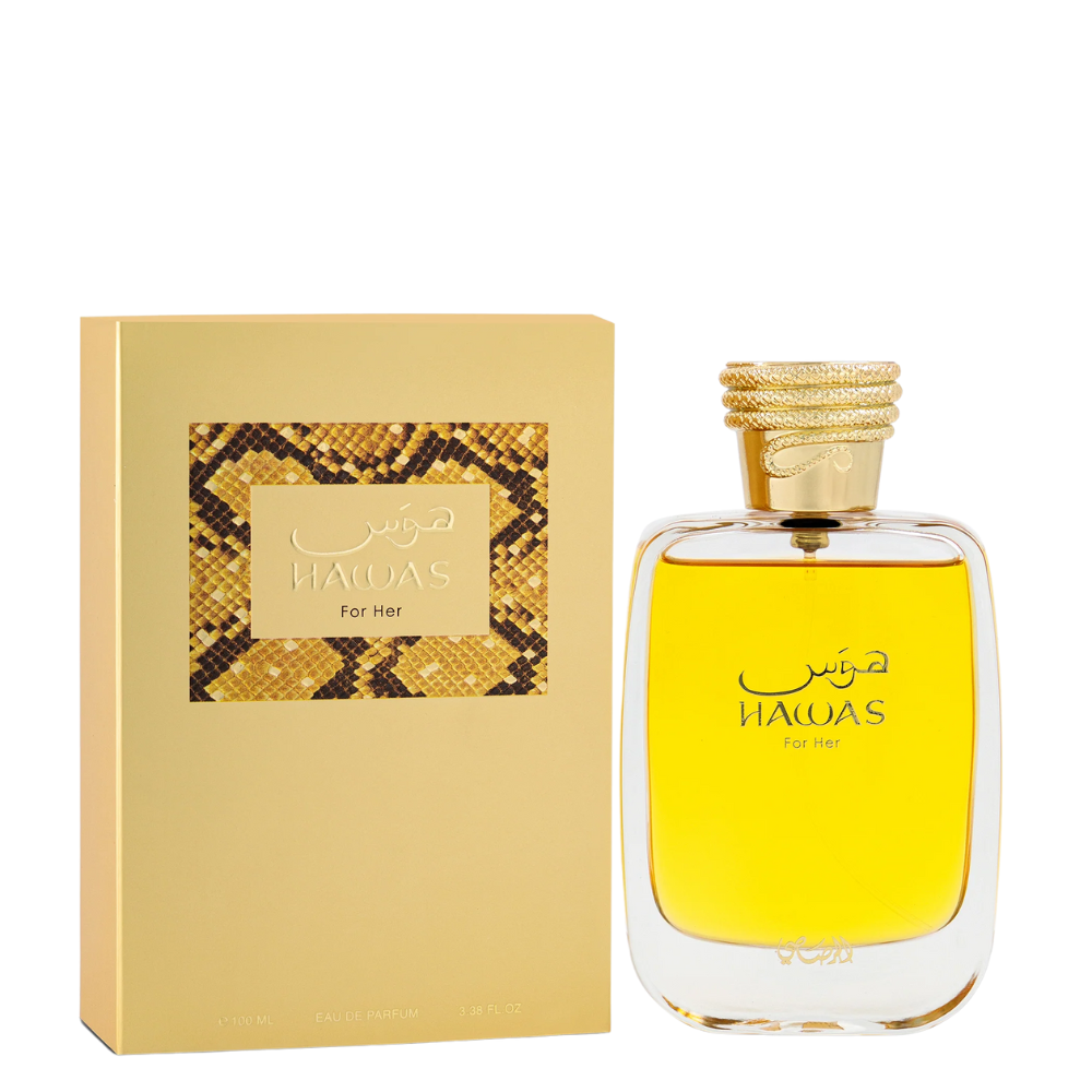 - Hawas for Her incorporates pomegranate, jasmine sambac and vetiver for an haute couture perfume aimed at women who are seeking an edgy, yet chic fashion statement. The sensational floral woody fragrance is infused with the exotic gourmand scents. Opening with fruity flavours of sparkling grapefruit, juicy pomegranate and red apple, the fragrance leads to a rich floral bouquet of silky jasmine absolute, graceful iris and vibrant citrus. The warm gourmand inflections from patchouli, vetiver and praline give it a very unique and addictive appeal. The sophisticated bottle, resplendent in golden hues with a python coiled around the stopper, truly reflects the alluring yet determined and passionate nature of the modern woman while a textured python on the pack captures the sensuality of the species with a flamboyance redolent of haute couture.
