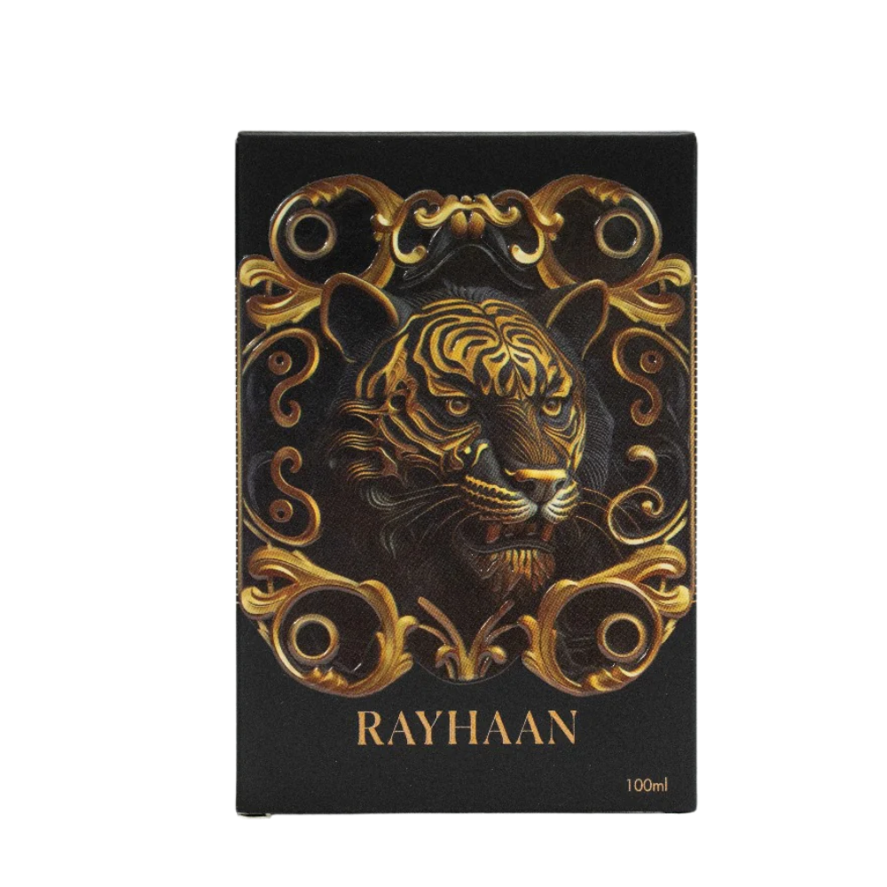 Introducing RAYHAAN TIGER CAL COLOGNE EDITION, a captivating fragrance that embodies raw strength and refined elegance. This seductive scent opens with a vibrant blend of spice and freshness, setting a bold first impression. At its heart lies a warm, exotic depth, balancing sensual florals with hints of rich and precious woods. The finish is an alluring fusion of Patchouli, Frankincense & Amber, leaving a magnetic trail that resonates with confidence and charisma. TIGER is crafted for the man who exudes power and sophistication—an unforgettable scent for the true modern seducer.